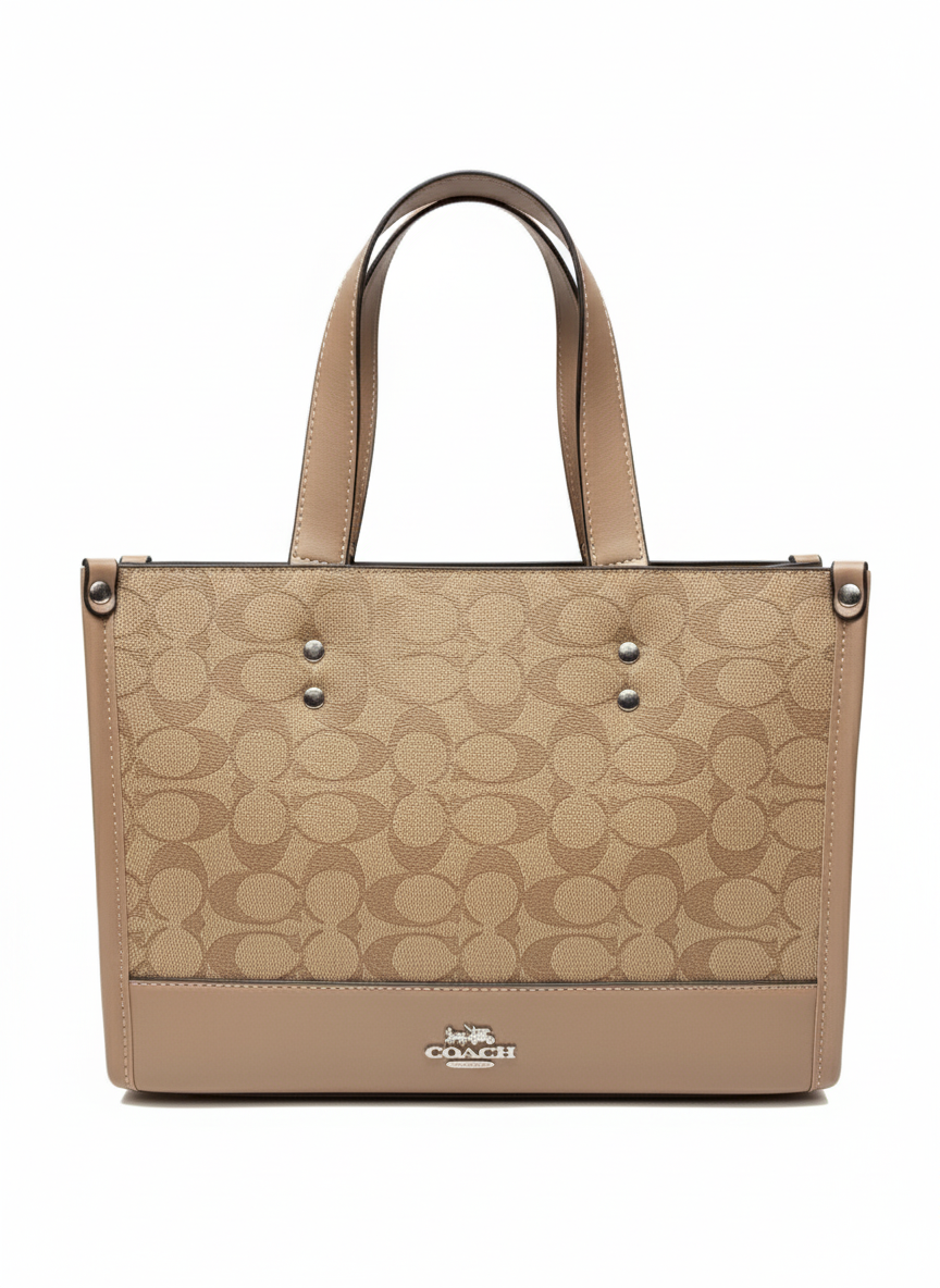 A timeless classic, this Coach tote bag showcases the brand’s iconic signature canvas paired with smooth beige leather trim. Designed with durability and sophistication in mind, it features dual top handles, polished silver-tone accents, and the Coach logo for a refined finish. Perfect for everyday use, work, or casual outings, this bag offers both style and practicality.