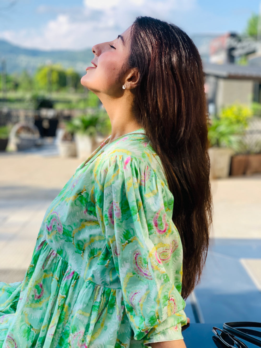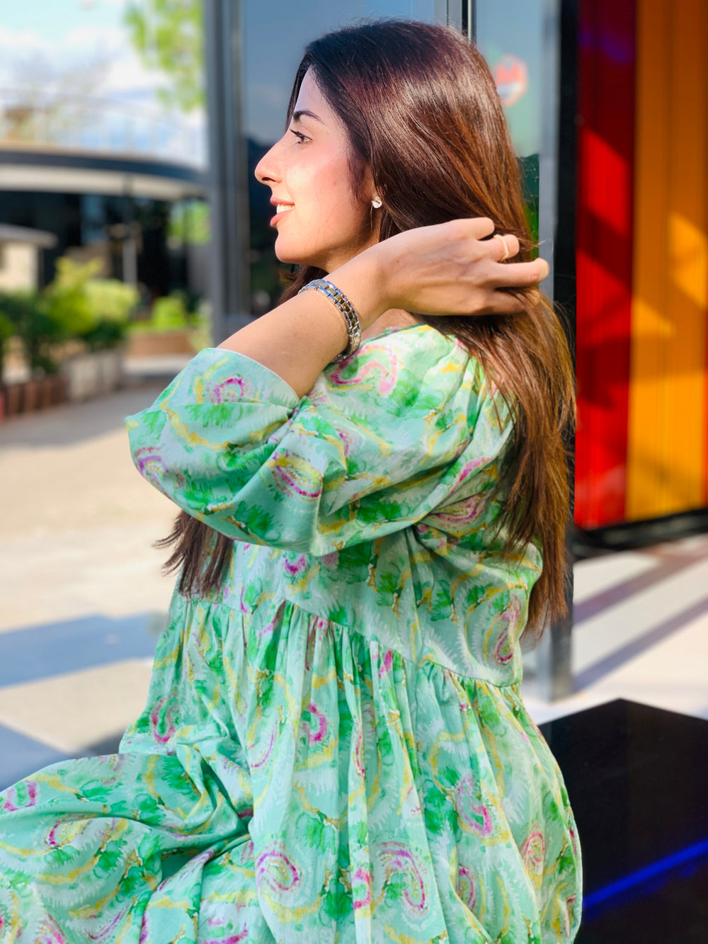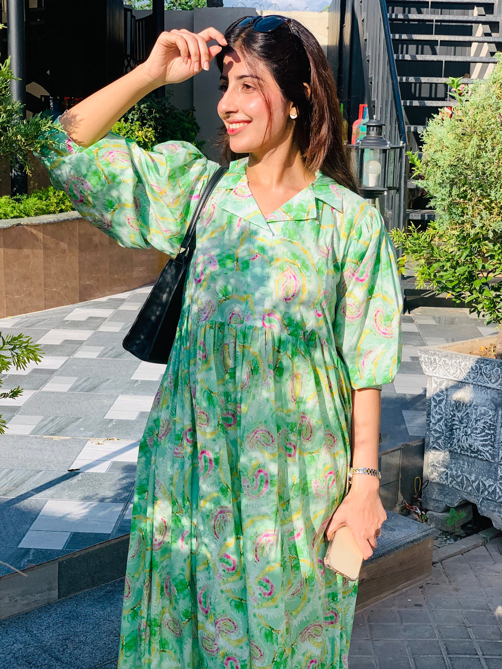 Stay fresh and stylish in this green maxi dress, designed with soft prints and a relaxed, flowy silhouette. Perfect for casual outings, summer gatherings, or day-to-day wear, this dress offers effortless elegance and comfort.