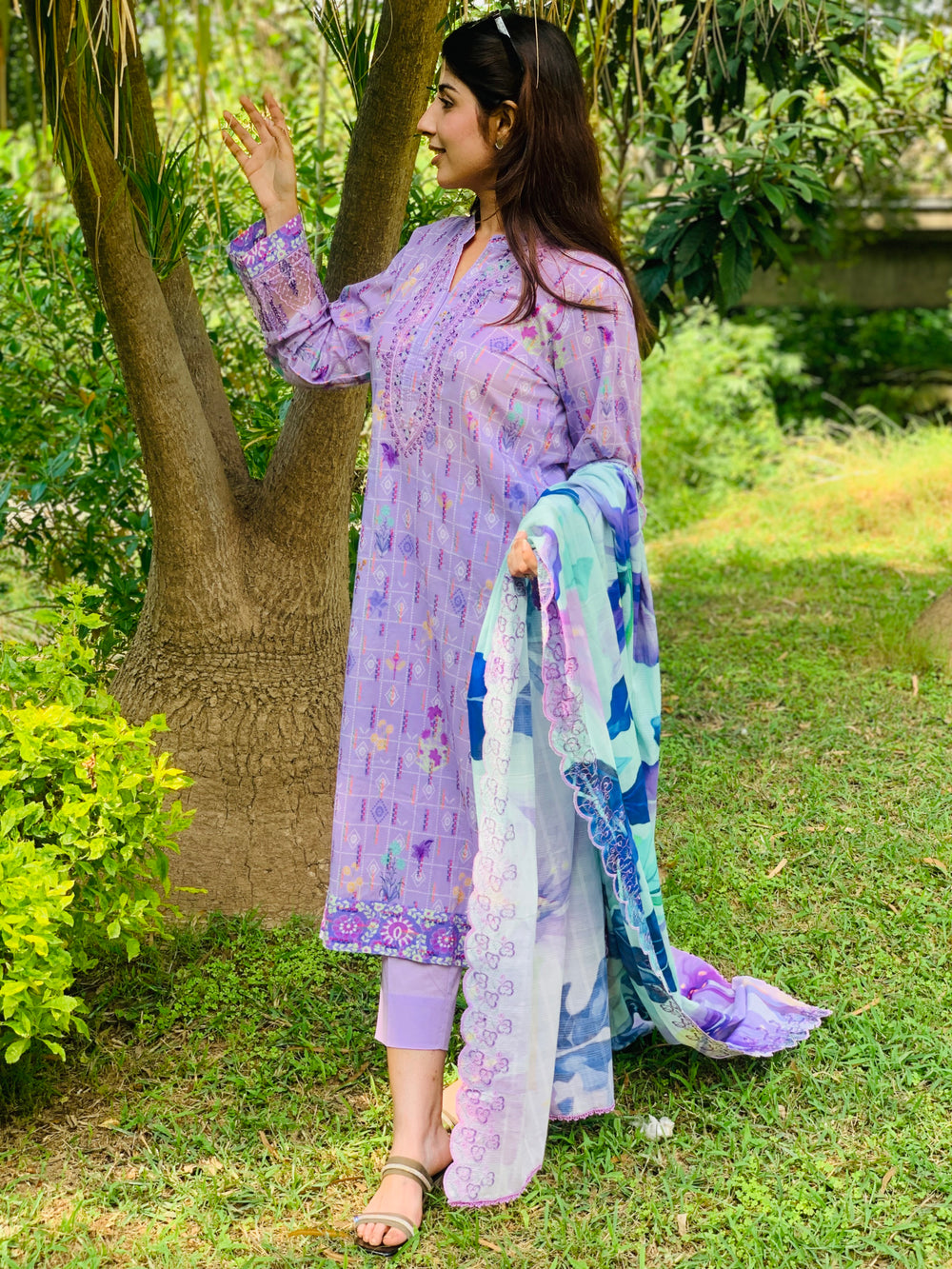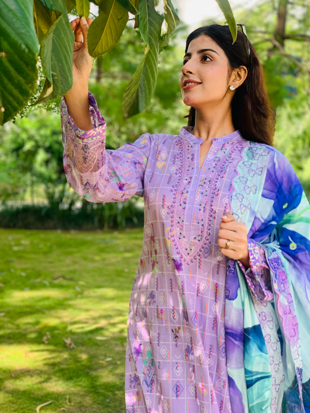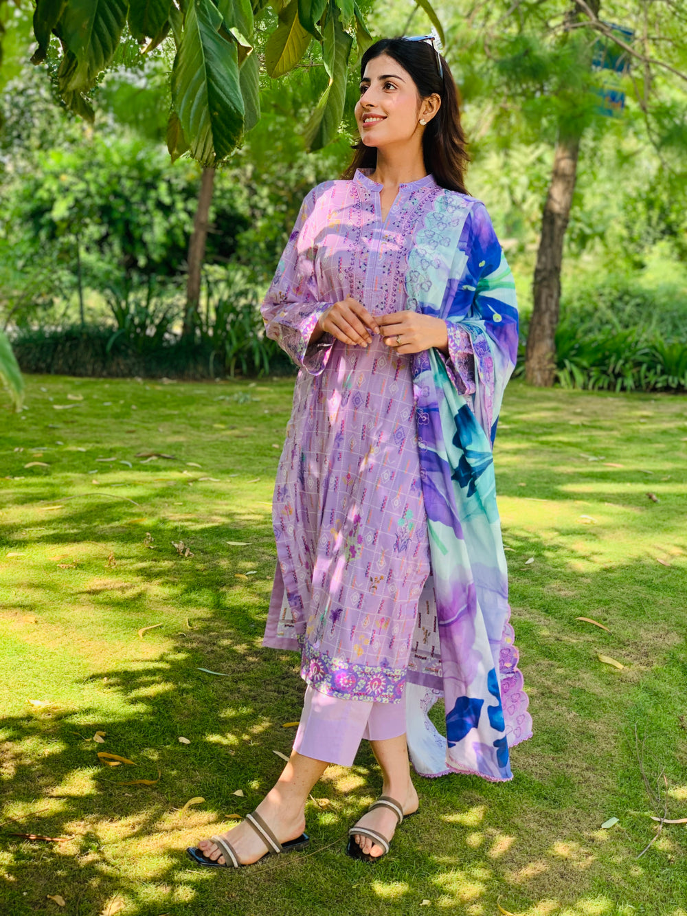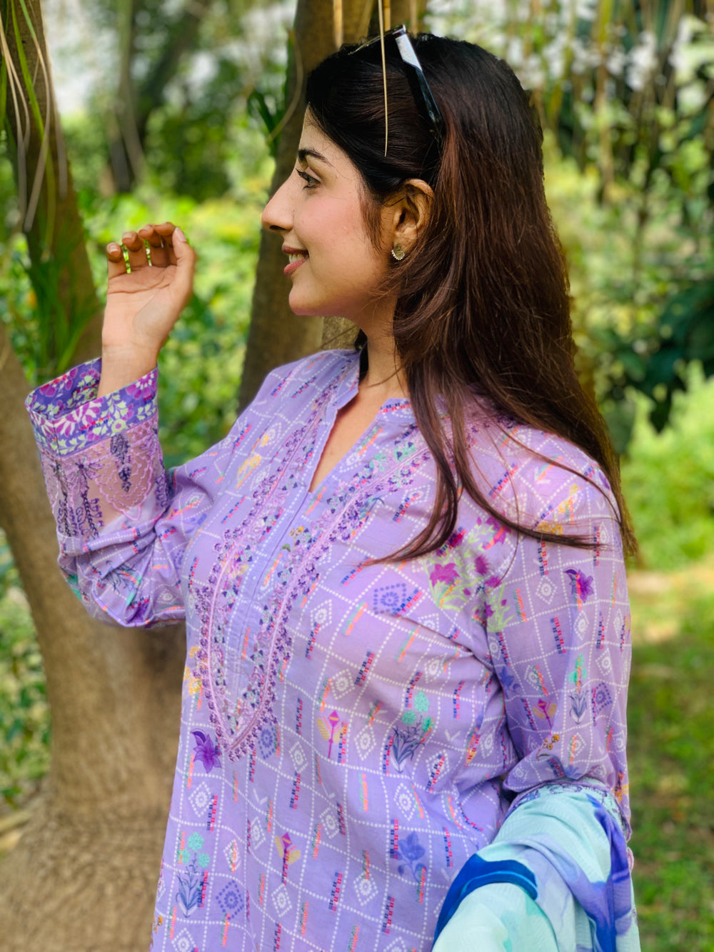 Add charm to your wardrobe with this lavender printed suit, featuring delicate embroidered accents and paired with a contrasting floral dupatta. A perfect blend of elegance and comfort, ideal for festive gatherings, casual outings, or day events.