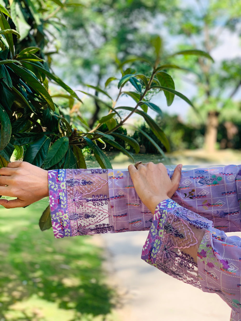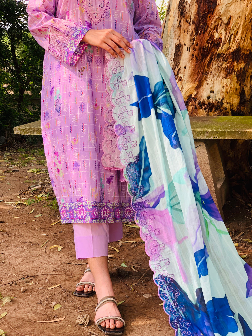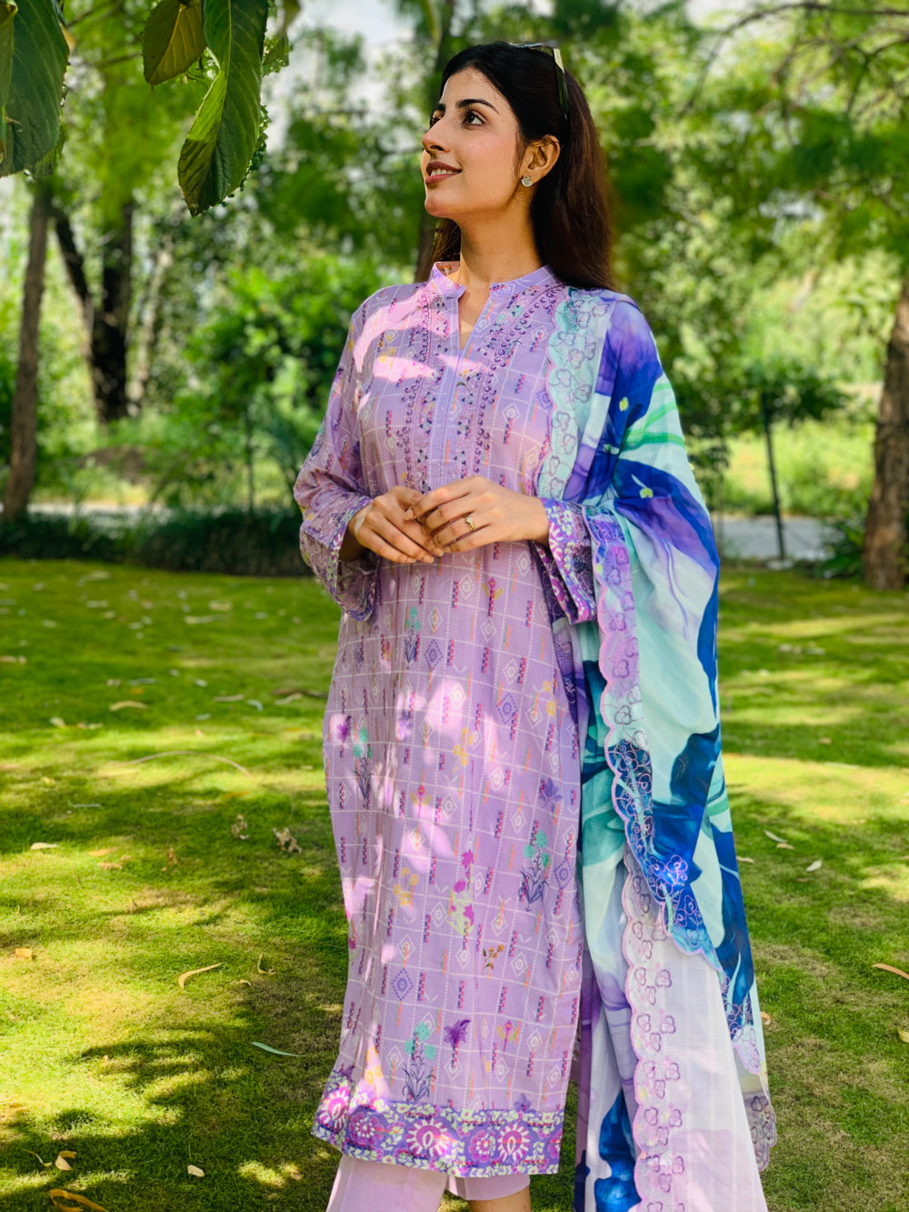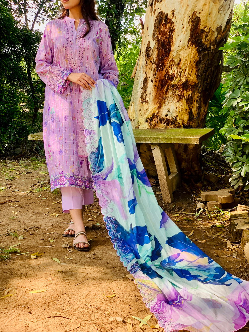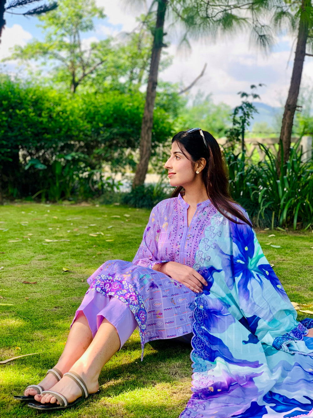 Add charm to your wardrobe with this lavender printed suit, featuring delicate embroidered accents and paired with a contrasting floral dupatta. A perfect blend of elegance and comfort, ideal for festive gatherings, casual outings, or day events.