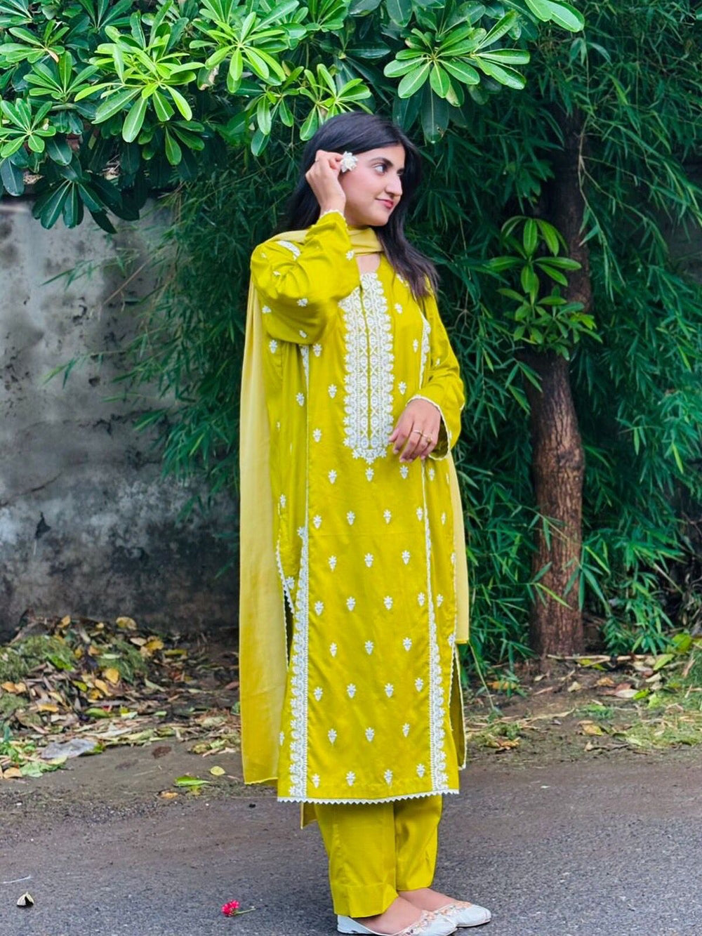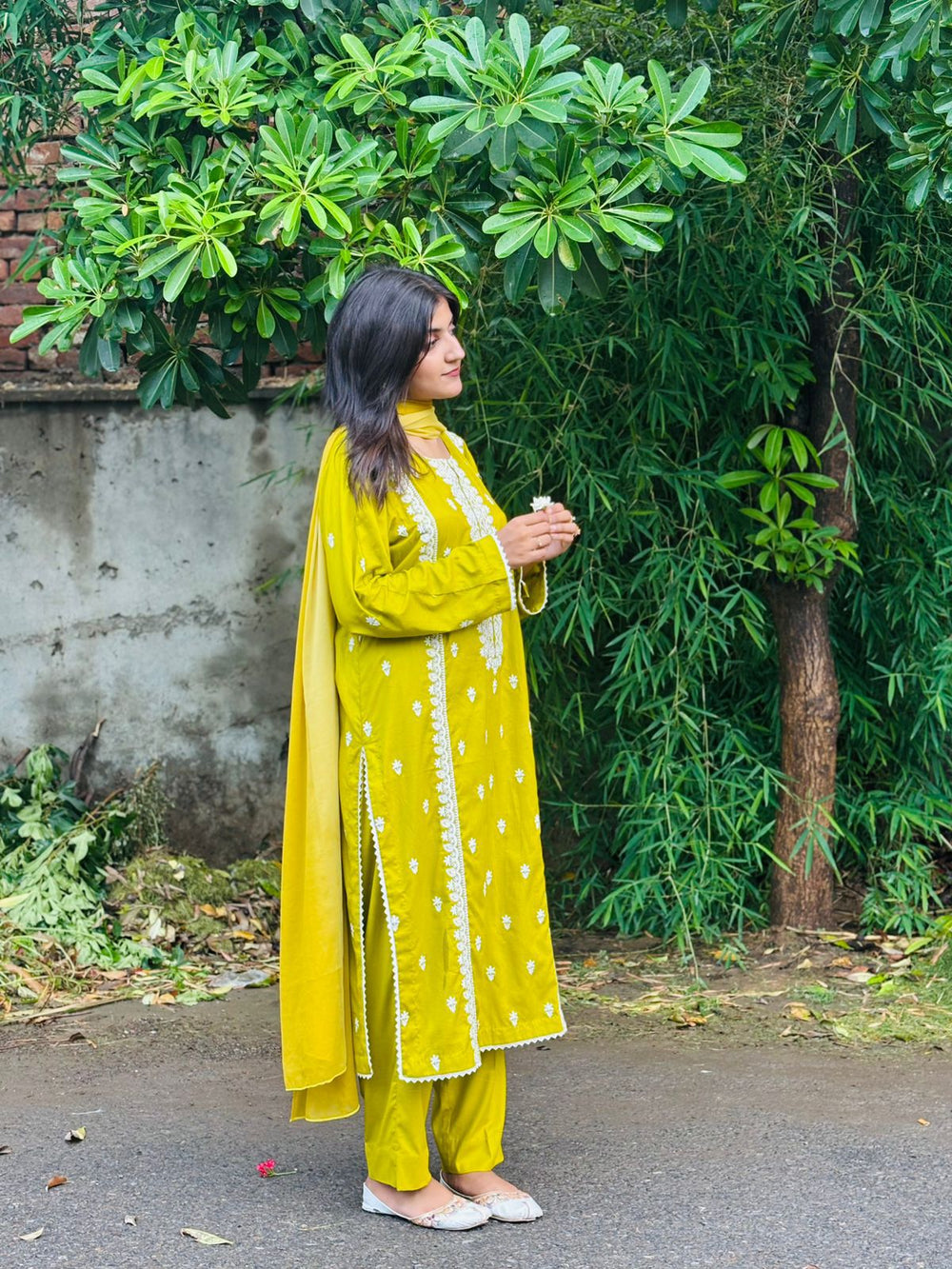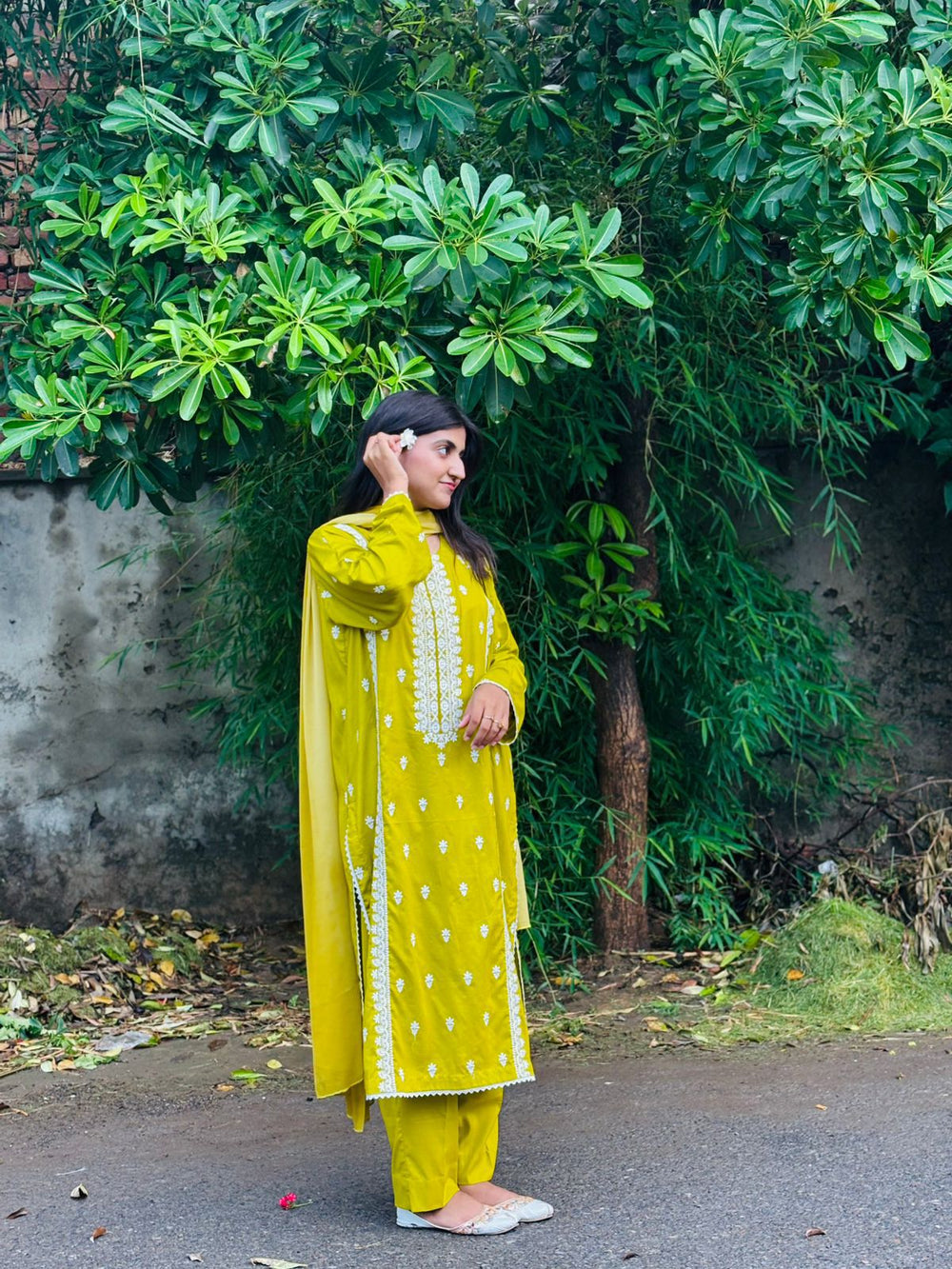 Embrace elegance with our Olive Lace Delight, a stunning 2-piece ensemble designed for both style and comfort. The soft olive green fabric is adorned with intricate white floral embroidery, adding a graceful touch to the simple yet sophisticated design. Delicate lace detailing along the neckline, sleeves, and Dupatta enhances its charm, creating a perfect balance between tradition and modern style.