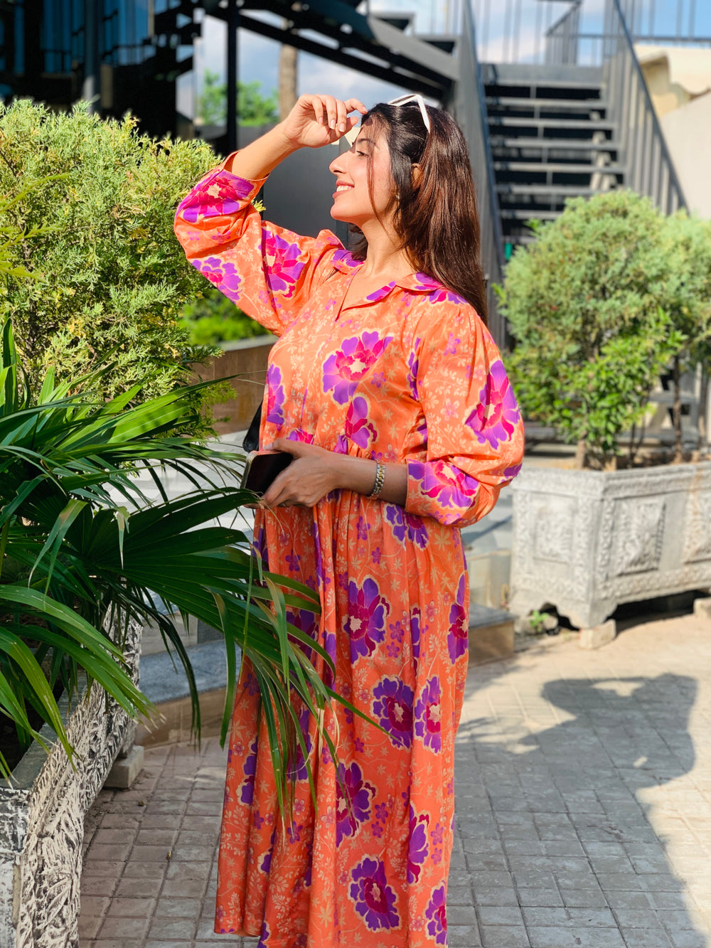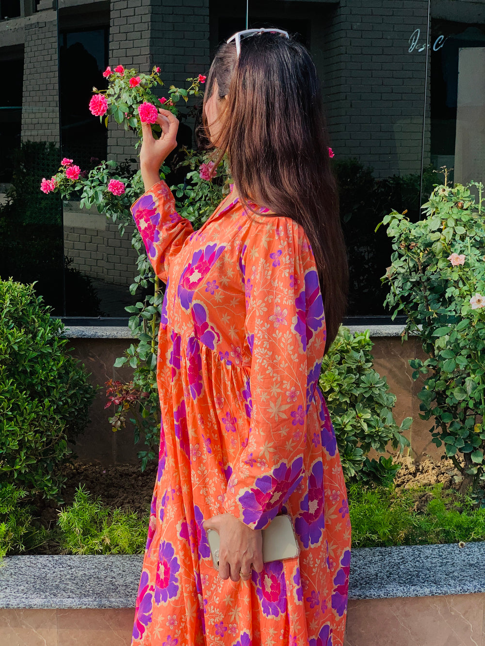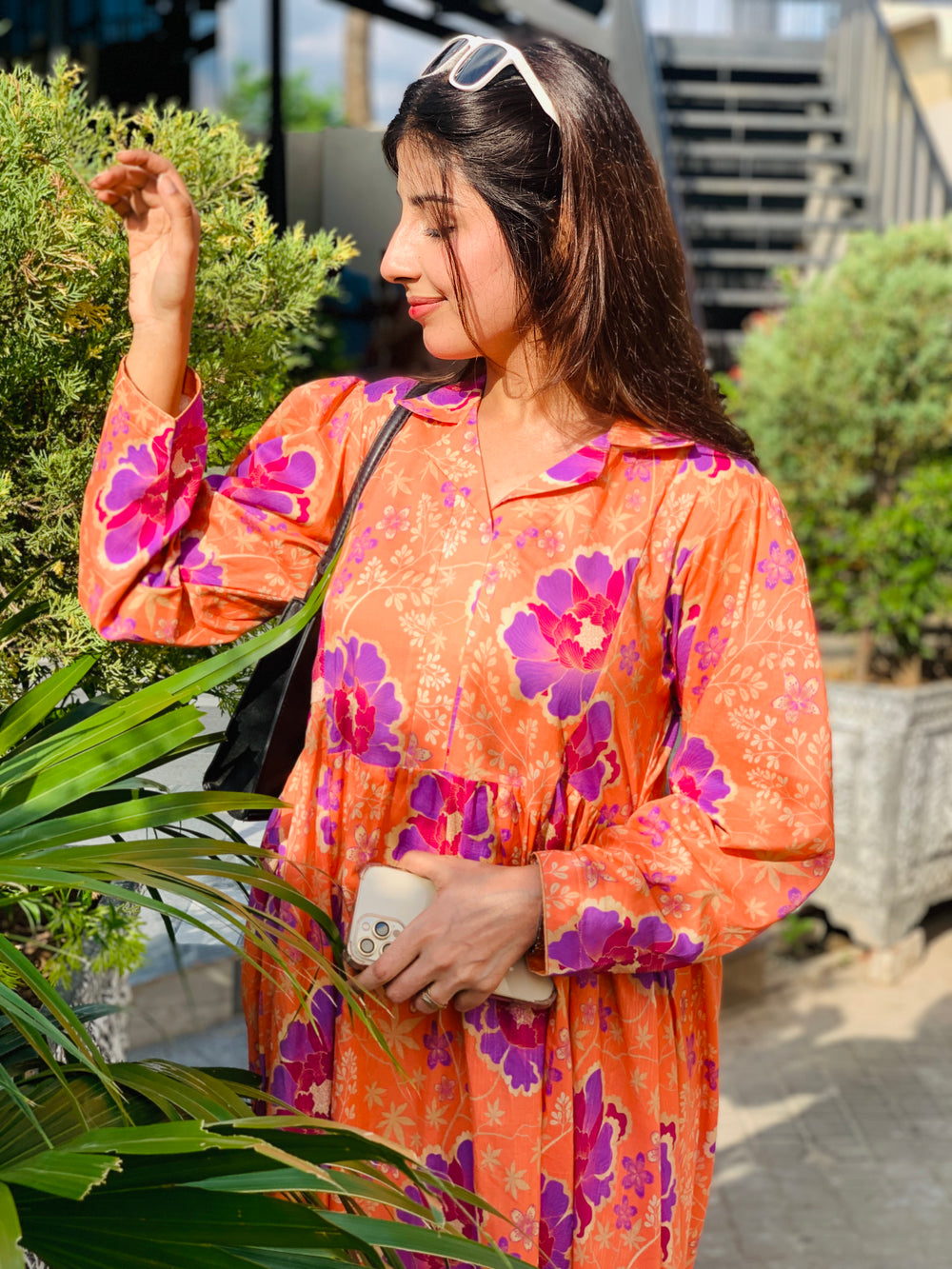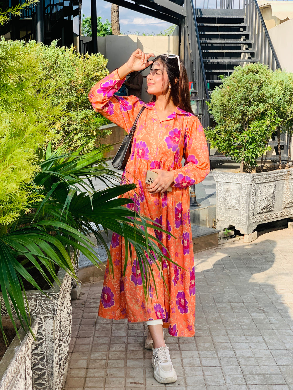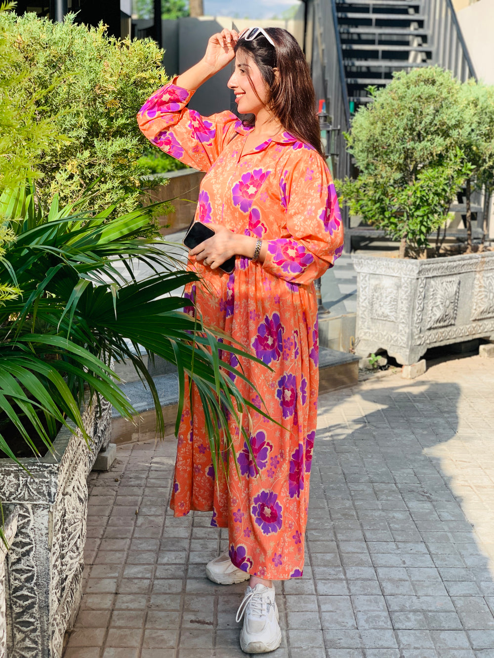 Bring a pop of color to your wardrobe with this vibrant orange maxi dress, styled with bold purple floral prints and a flowy silhouette. Perfect for summer outings, brunches, or casual gatherings, this dress combines comfort with a lively, fashionable look.