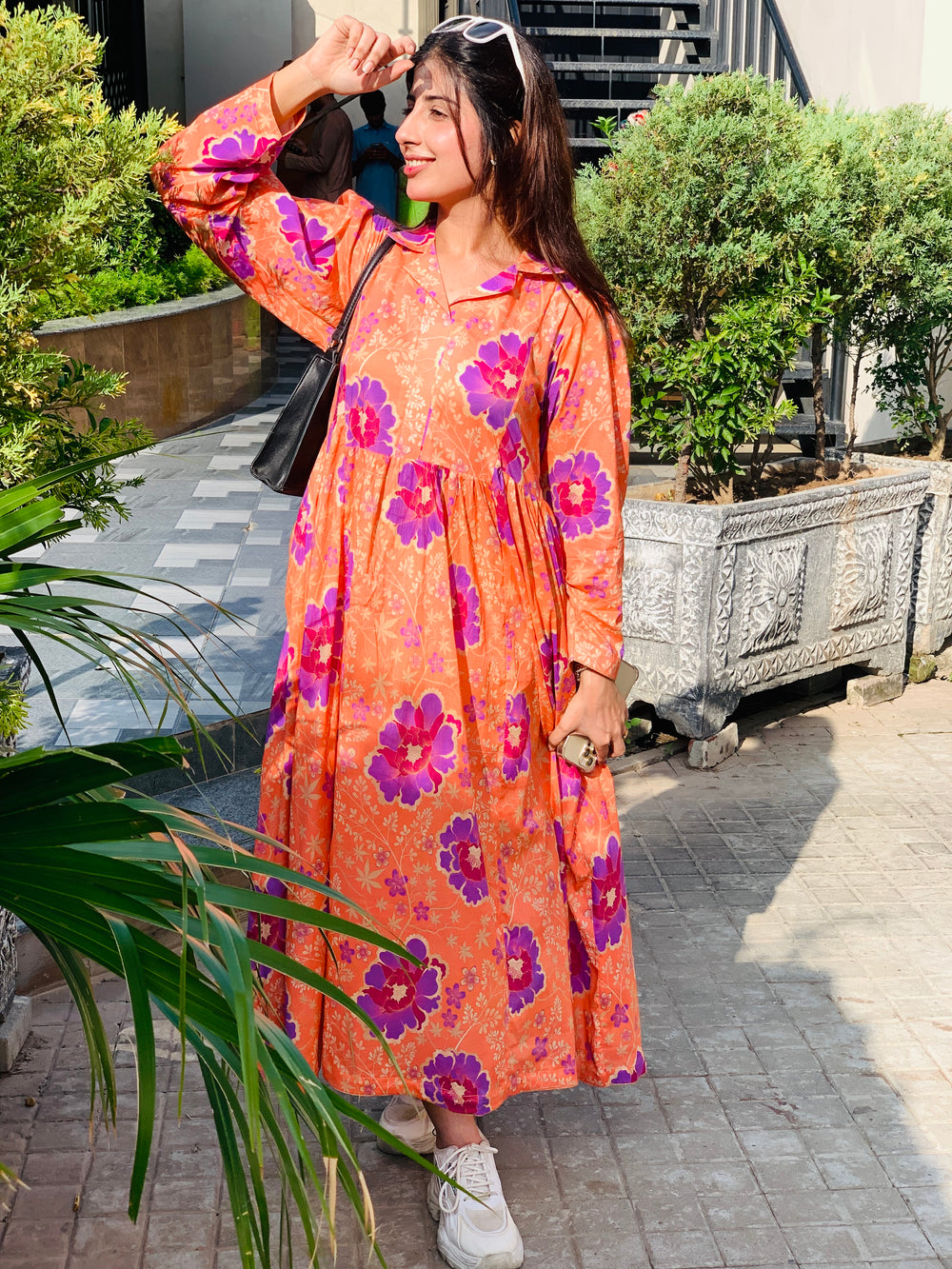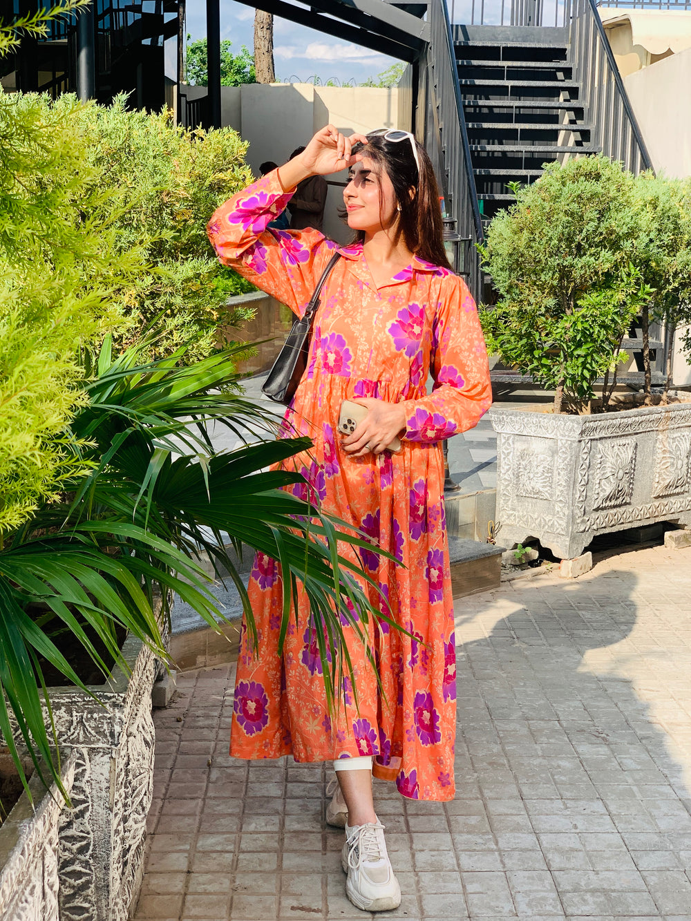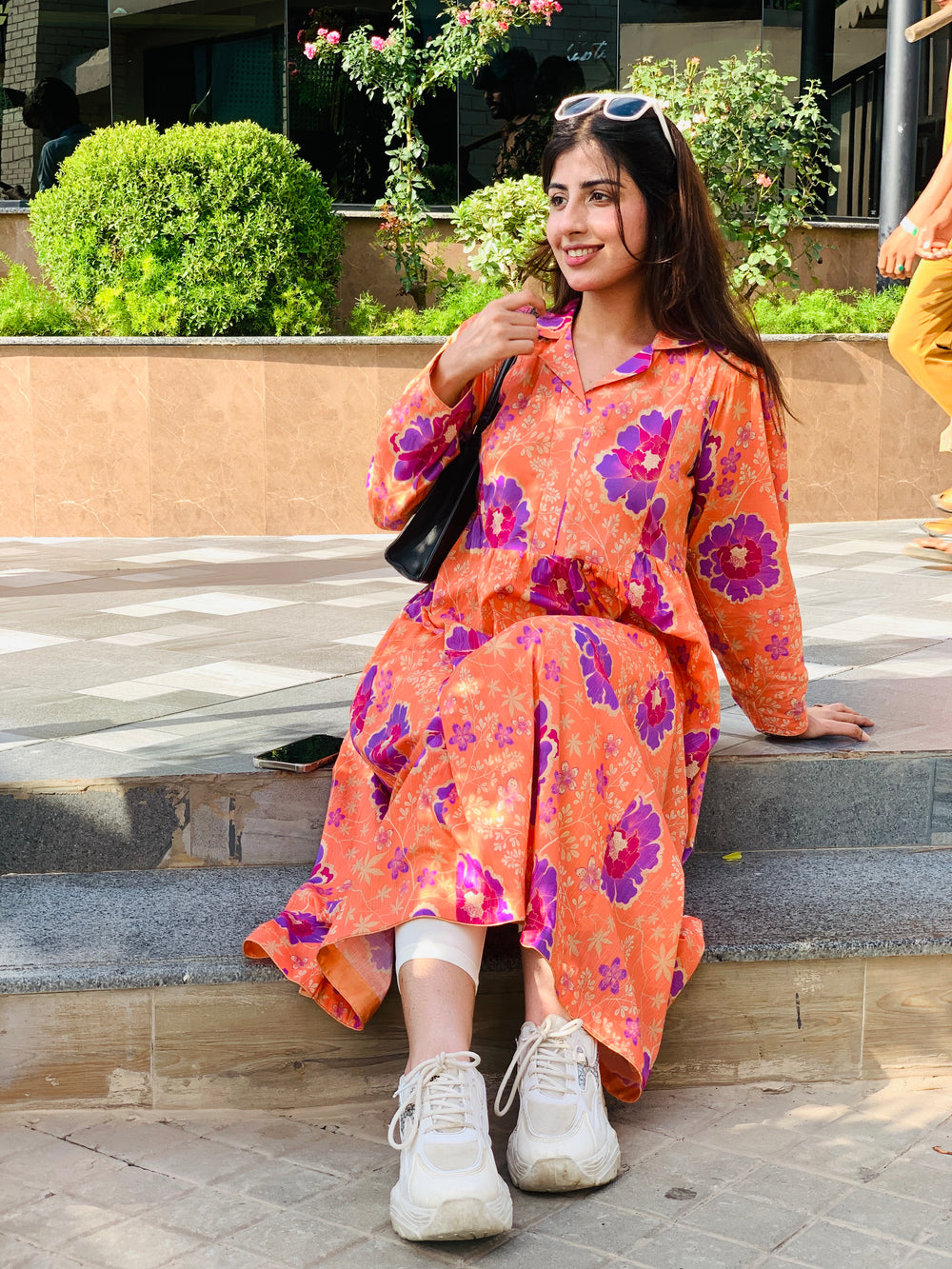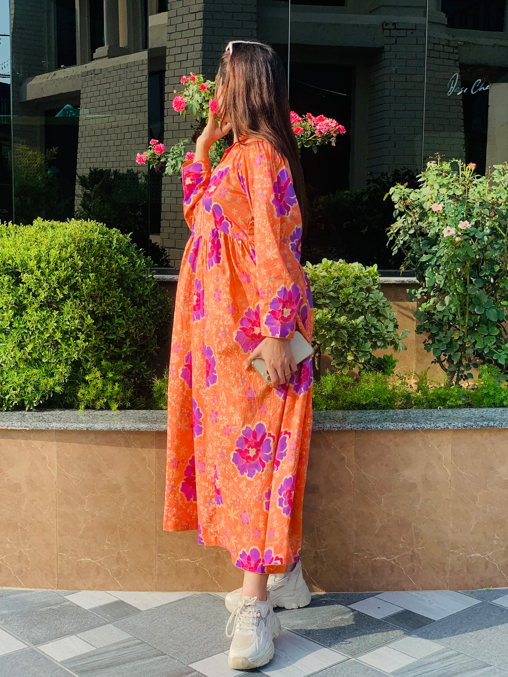 Bring a pop of color to your wardrobe with this vibrant orange maxi dress, styled with bold purple floral prints and a flowy silhouette. Perfect for summer outings, brunches, or casual gatherings, this dress combines comfort with a lively, fashionable look.