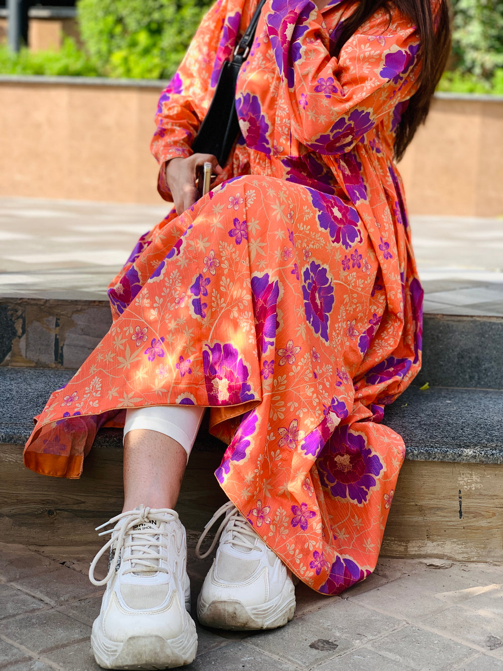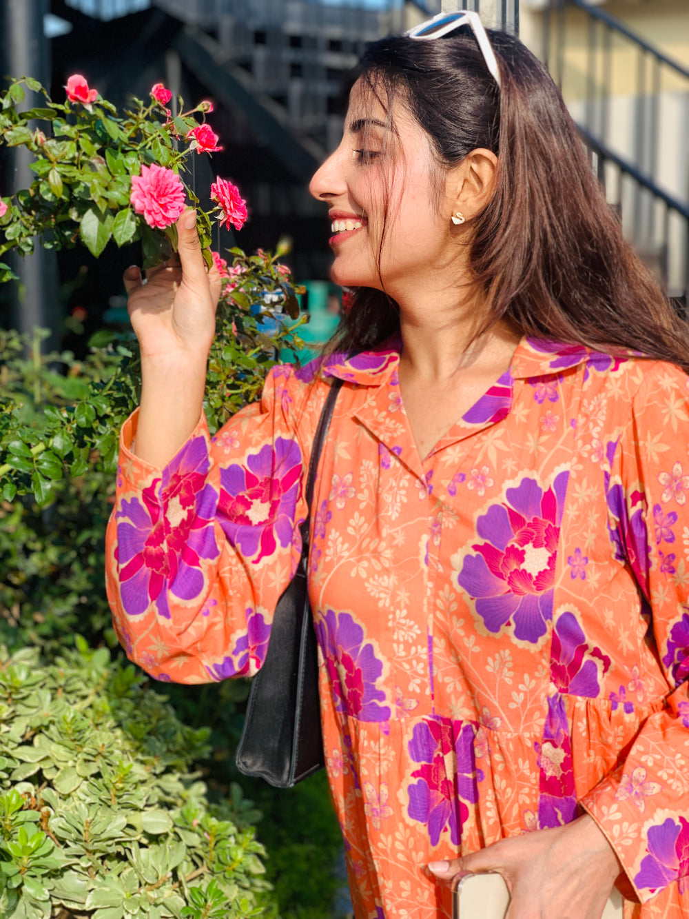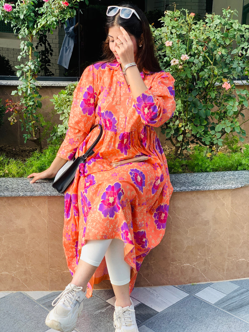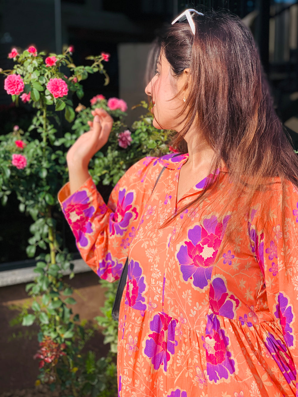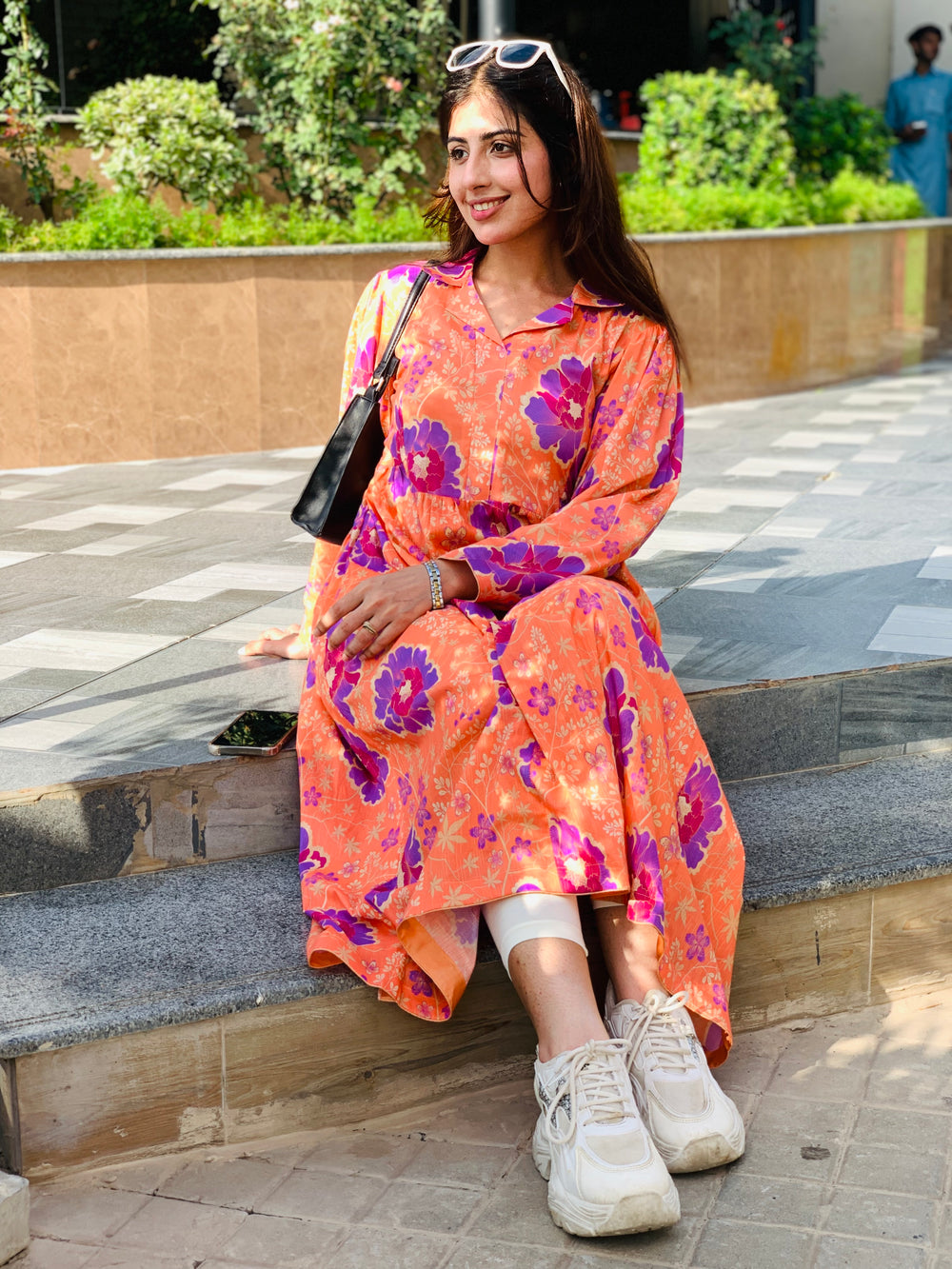 Bring a pop of color to your wardrobe with this vibrant orange maxi dress, styled with bold purple floral prints and a flowy silhouette. Perfect for summer outings, brunches, or casual gatherings, this dress combines comfort with a lively, fashionable look.