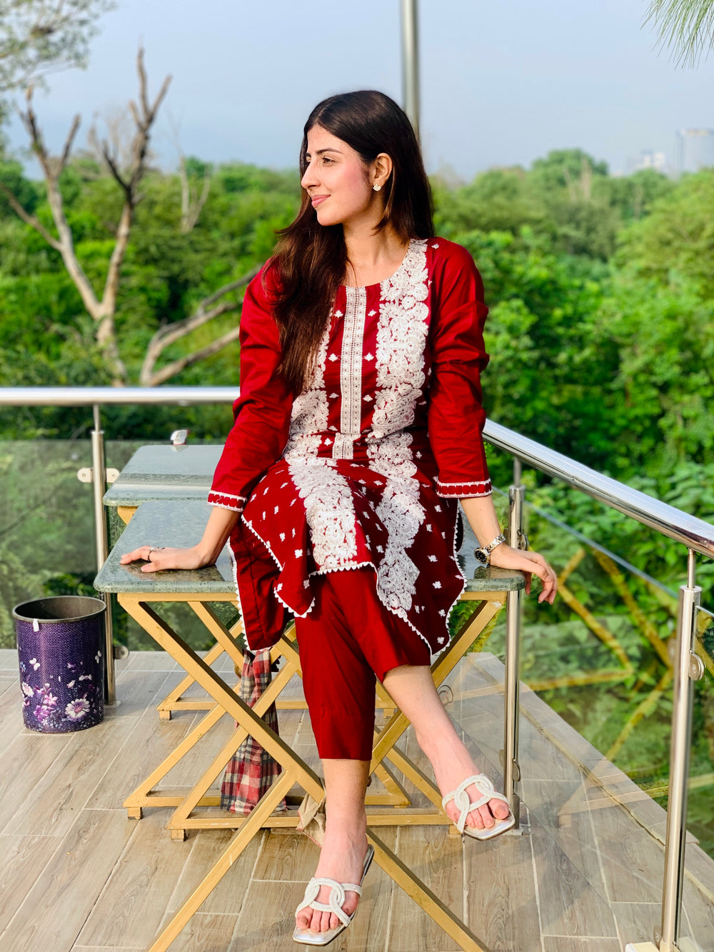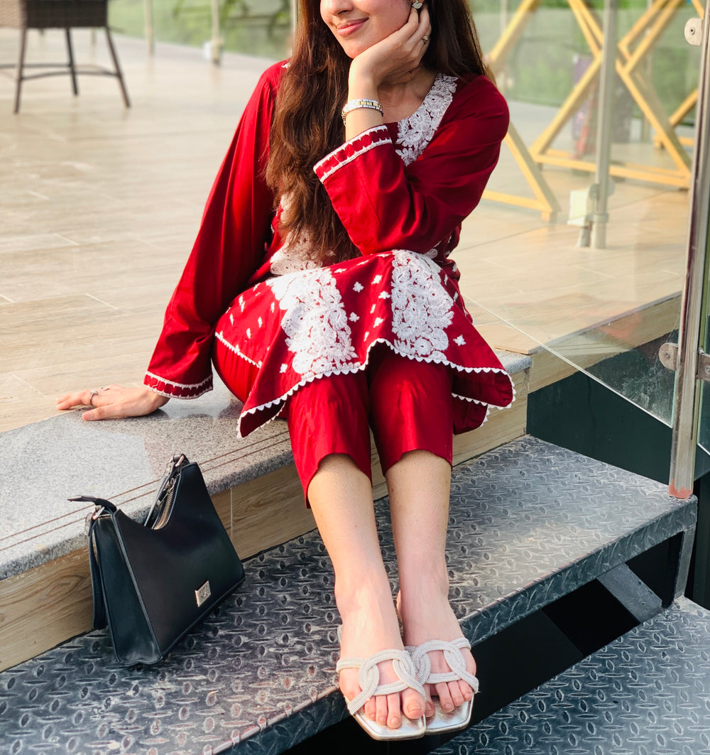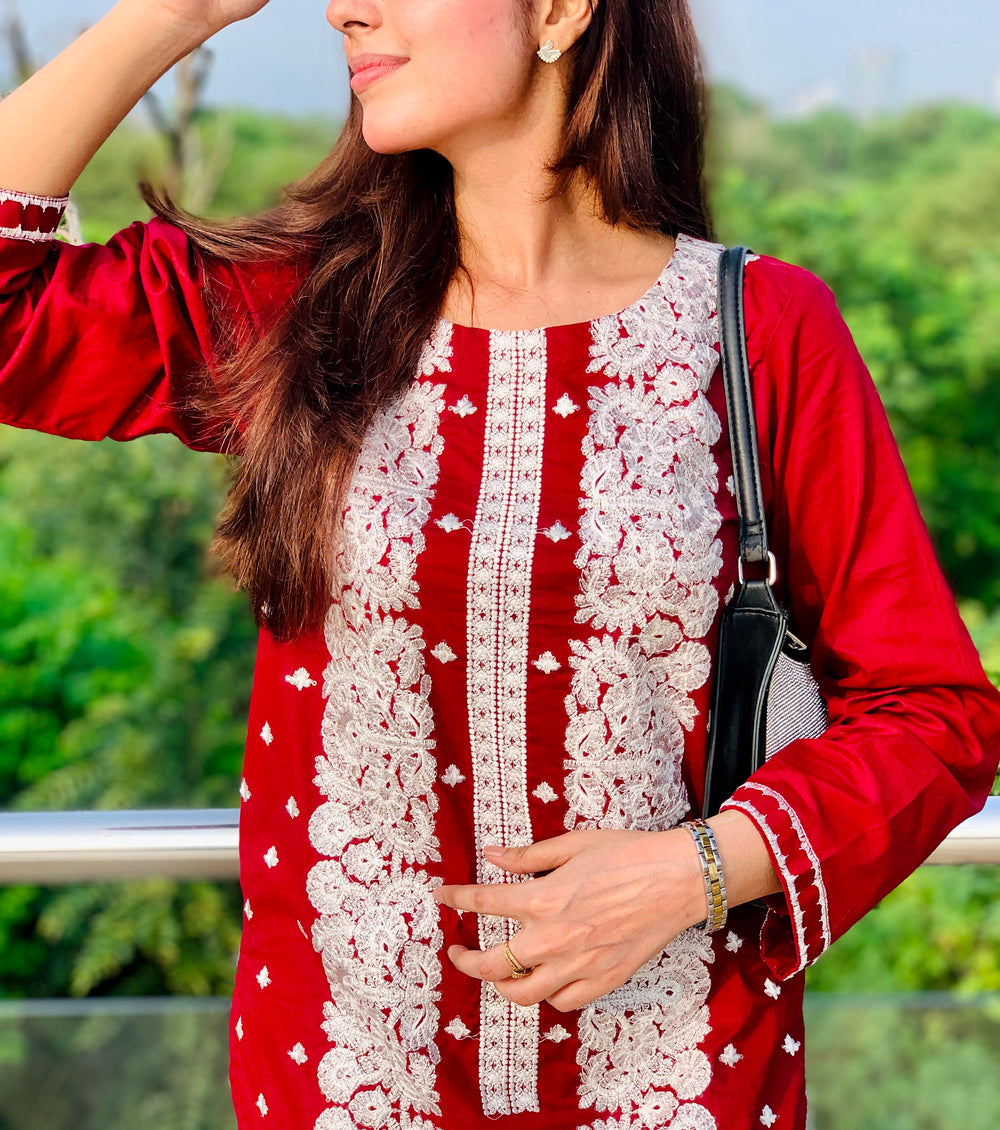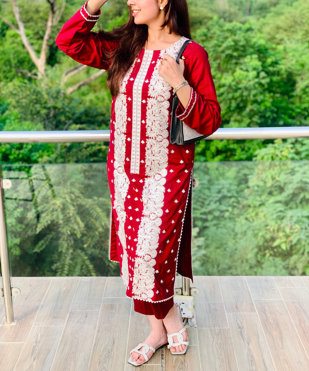 Stand out in this striking red suit, beautifully highlighted with intricate white embroidery on the front panel and sleeves. Paired with matching trousers, this outfit is perfect for festive occasions, parties, or elegant daywear.